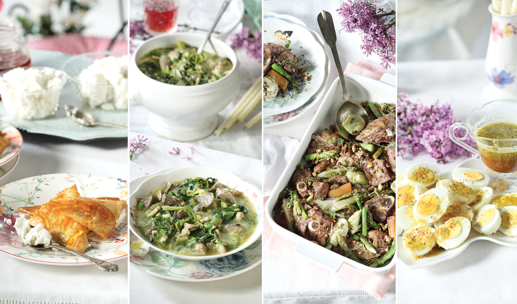 Μαγειρίτσα με αρωματικά χόρτα και γλυκό κρασί, αυγοσαλάτα με εξωτικό λαδόξιδο, κατσικάκι στη γάστρα με ανοιξιάτικα λαχανικά και Μοσχάτο, τρίγωνα από φύλλα κρούστας με σουσάμι, φρέσκια μυζήθρα και μέλι. Πρωτότυπες, λαχταριστές συνταγές και όλα τα μυστικά για να γλιτώσουμε κόπο και χρόνο κατά την παρασκευή τους.