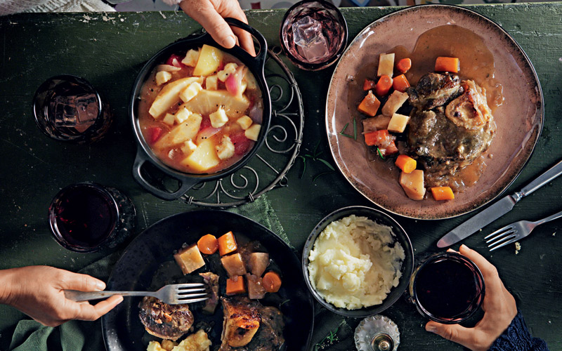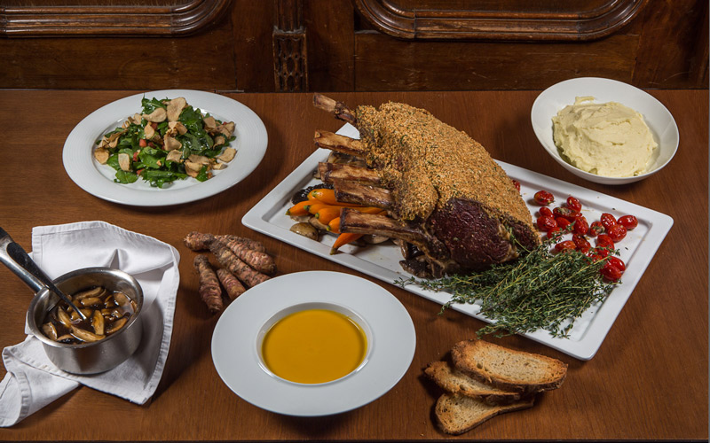 Ένα πλούσιο και γιορτινό μενού με βελουτέ γλυκοπατάτας και στραγγιστό γιαούρτι, ροστ μπιφ με κρούστα αρωματικών και σάλτσα μανιταριών με μπράντι και σαλάτα με ρόκα, τσιπς αγκινάρας Ιερουσαλήμ και καρύδια.