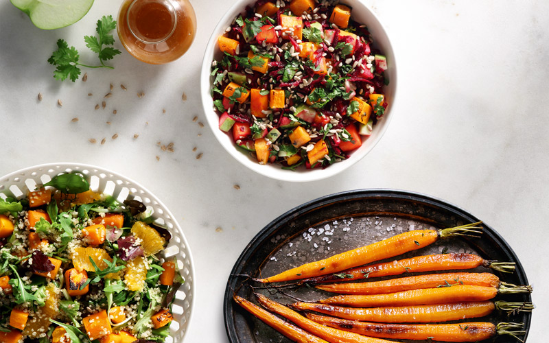 Ζεστές σαλάτες με ψητά καρότα που συνδυάζονται με παντζάρια και καυκαλήθρες αλλά και κινόα με πρασινάδες.