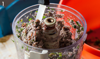 Βάζουμε σε δόσεις το χταπόδι, τα κρεμμυδάκια, το σκόρδο και τα μυρωδικά στο μπλέντερ ή στο μούλτι και τα λιώνουμε μέχρι να γίνουν πολτός (φωτ. 1). Πιπερώνουμε και προσθέτουμε το παξιμάδι ή τη φρυγανιά (φωτ. 2). Ζυμώνουμε καλά - πρέπει το μείγμα να γίνει σφιχτό και να μην κολλάει στα χέρια. Αν χρειαστεί, προσθέτουμε επιπλέον τριμμένη φρυγανιά ή παξιμάδι.