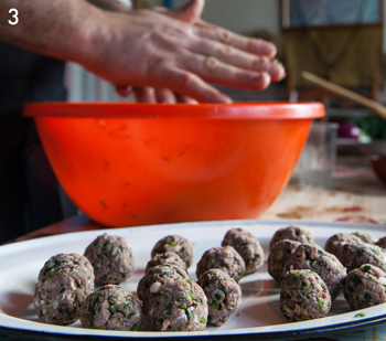Βάζουμε το μείγμα στο ψυγείο για 30 λεπτά να σφίξει. Πλάθουμε κεφτέδες μικρούς (φωτ. 3) και τους αλευρώνουμε. Τους τινάζουμε να φύγει το περιττό αλεύρι. Βάζουμε λάδι σε ένα τηγάνι να κάψει (2 εκ. από τον πυθμένα του σκεύους) και τηγανίζουμε τους κεφτέδες μέχρι να ροδίσουν. Τους βγάζουμε σε ένα πιάτο με χαρτί κουζίνας, να στραγγίξουν από το περιττό λάδι.